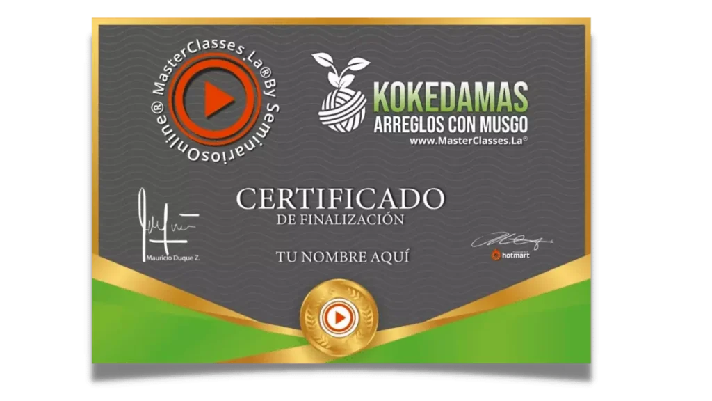 Una vez finalizado el curso recibirás el certificado en que consta que aprobaste satisfactoriamente el curso de «KOKEDAMAS ARREGLOS CON MUSGO».