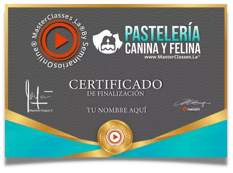 Una vez finalizado el curso recibirás el certificado en que consta que aprobaste satisfactoriamente el curso de «PASTELERÍA CANINA Y FELINA».